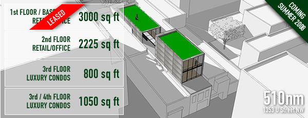 510nm offers easy access to all these cultural amenities and it is only one block away from the U Street/Cardozo metro stop on the green/yellow line. The redeveloped building will include a 3000+ square foot rental retail space with a U Street frontage, a 2500+ square foot rental retail/office space on the second floor, and two rental luxury condos on the top floors.